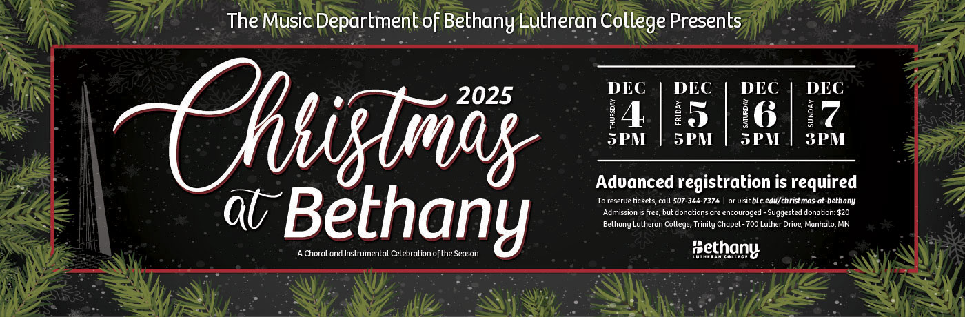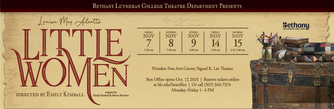 Each season, the Bethany Lutheran College Theatre Department brings stories to life through four major productions featuring students in both performance and production roles. The Sigurd K. Lee Theater is located in the Ylvisaker Fine Arts Center on the campus of Bethany Lutheran College. The building address is 715 Luther Dr, Mankato, MN. Free event parking is available in Lot 5 and Lot 7, or other visitor parking areas around campus. See the Campus Maps page for more information.